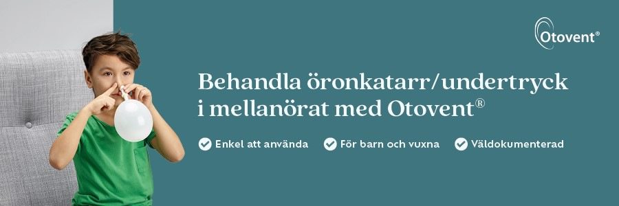 Vad är öronkatarr/sekretorisk mediaotit Öronkatarr kan uppstå efter förkylning och kan leda till lockkänsla och hörselnedsättning. Både vuxna och barn kan drabbas av vätska i mellanörat som inte förvinner direkt efter en mellanöreinflammation. Det är extra viktigt att följa upp barn efter mellanöreinflammation då en hörselnedsättning kan påverka talutvecklingen. Även bakåtsniffning (snytning inåt vid förkylning) kan orsaka öronkatarr. Tryckskillnader vid flygning och dykning kan också skapa ett undertryck i mellanörat. Otovent är ett väldokumenterat hjälpmedel som kan användas om du eller ditt barn inte kan utjämna trycket på egen hand. Otovent ska alltid användas tillsammans med en vuxen. OBS! Otovent-ballongerna är designade för optimal effekt med exakt motstånd vid varje uppblås, därför ska inga andra ballonger användas. Otovent-ballongerna innehåller latex. Varje ballong kan användas för 20 uppblåsningar.