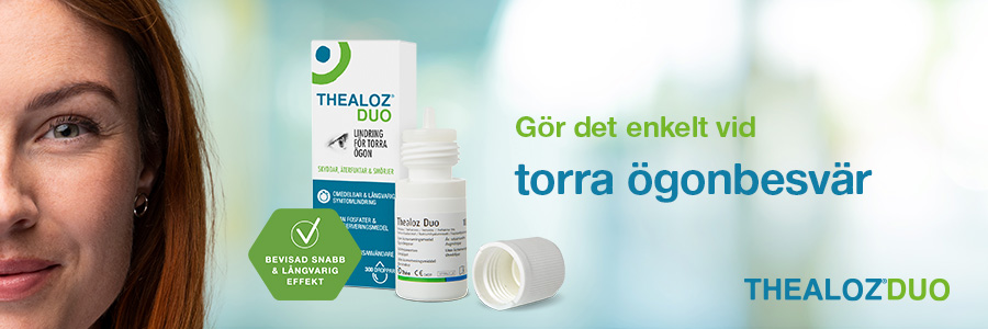 Thealoz Duo är ett varumärke som erbjuder produkter för att få ögats tårfilm i balans. Återfukta och skydda ögonen med Thealoz Duo, Thealoz Duo Gel och Thealipid.Symtom av torra ögon är varierande i sin karaktär och kännetecknas av obehag i ögat med eller utan synstörningar. Mer än var fjärde svensk lider av torra ögon och det kan vara svårt att förstå att det är torra ögon som man drabbats av då symtomen skiftar* (källa: Marketresearch Dry Eyes Sweden 2020 SIFO NAVIGARE)