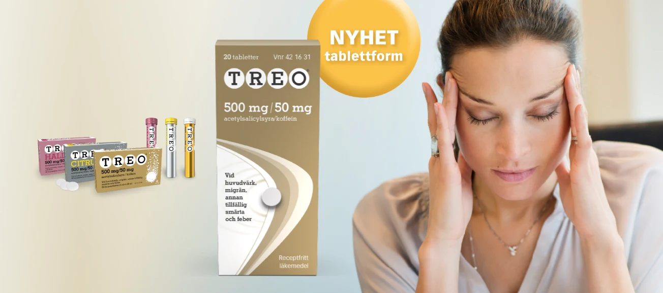 TREO® brustablett (acetylsalicylsyra 500 mg/koffein 50 mg) är ett receptfritt läkemedel mot huvudvärk, migrän, annan tillfällig smärta och feber. Treo ska inte användas av barn under 14 år, eller ges till personer under 18 år med feber utan att läkare tillfrågats. Kontakta läkare om symtomen försämras eller inte förbättras inom 3 dagar vid feber och migrän eller 5 dagar vid smärta. Behandling under någon del av graviditeten skall endast ske efter läkares ordination. Läs bipacksedeln noga före användning. ©Conaxess Trade Sweden Tel: +46 764 95 00 70