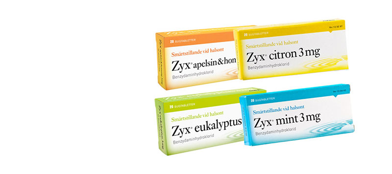 Zyx är ett receptfritt läkemedel och innehåller benzydamin* som lindrar smärta och irritation i mun och svalg. Zyx sugtabletter lindrar halsont och har visat sig förbättra sväljsvårigheter och minska svalgsvullnad. Du får snabb smärtlindring inom 12 minuter.